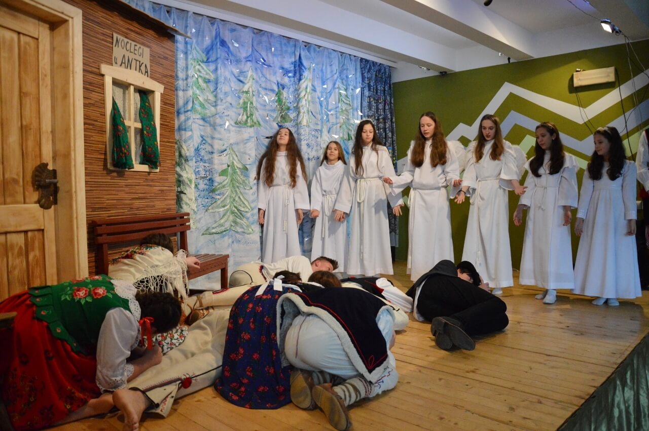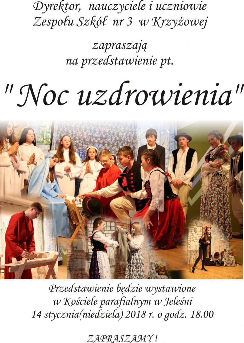 Pod opieką Pana Józefa Hubki powstał zabawny, pełen emocji, chwytający za serce spektakl pt. „Noc uzdrowienia”. Jak to jest już w tradycji naszych szkolnych jasełek nie, zabrakło w nich wątków góralskich, tak bliskich naszym sercom. Uczniowie pięknie prezentowali się w strojach, o które zadbała Pani Iwona Stolarczyk. Po raz kolejny mogliśmy także podziwiać świetną scenografię autorstwa Pani Ewy Stokłosy i Pana Jana Waligóry. Nieocenionych  rad  w czasie prób udzielał Pan Piotr Piecha zaprzyjaźniony ze szkołą aktor teatralny.